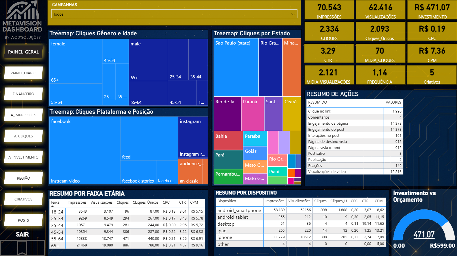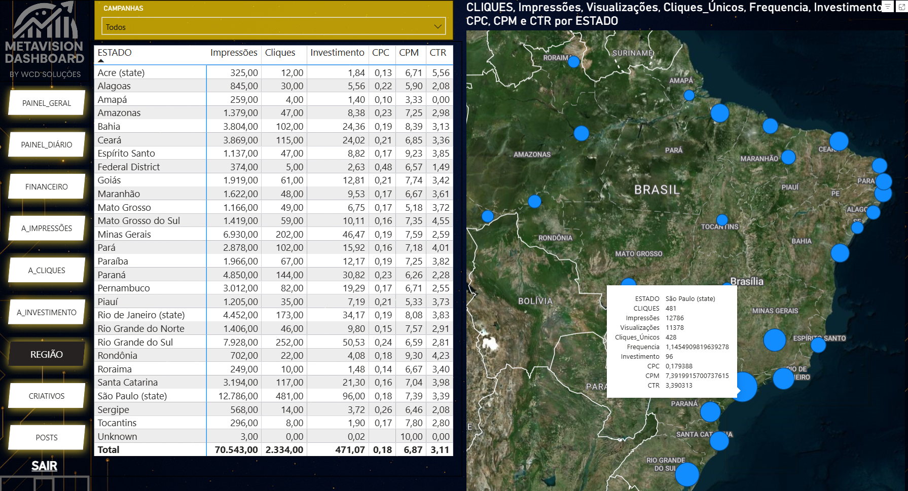 Comportamento, regiões e métricas primárias em um só lugar.