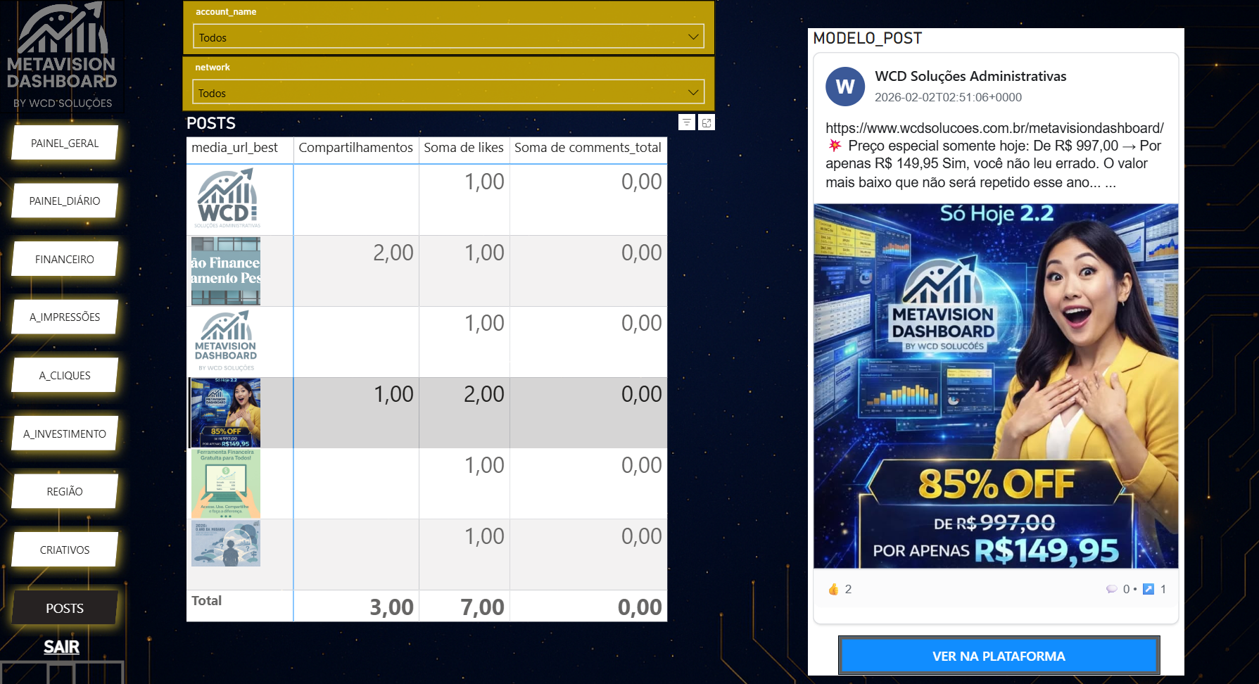 Análise de posts e criativos de maior impacto.